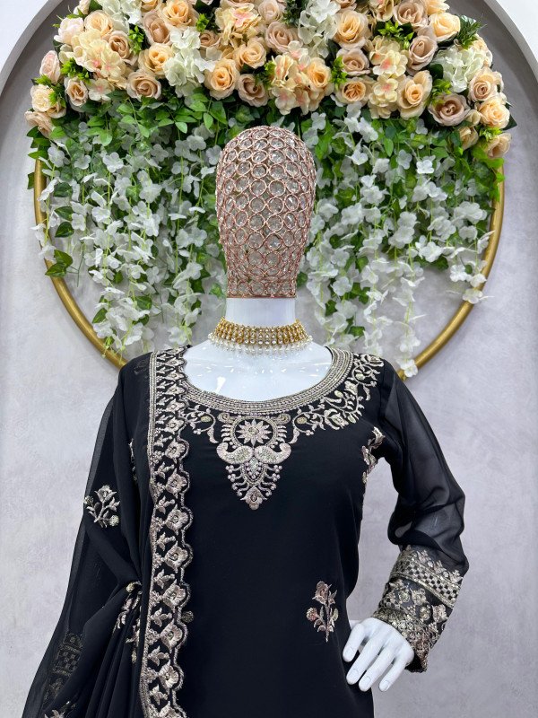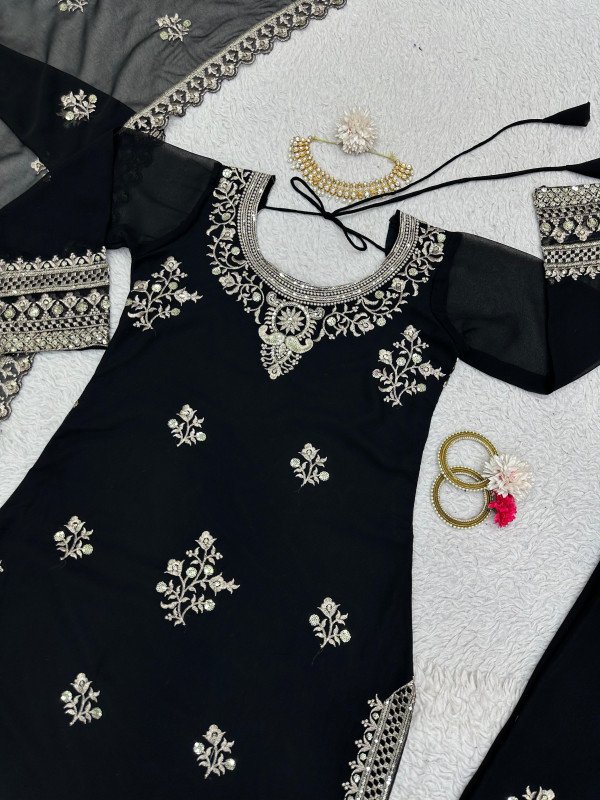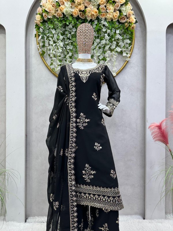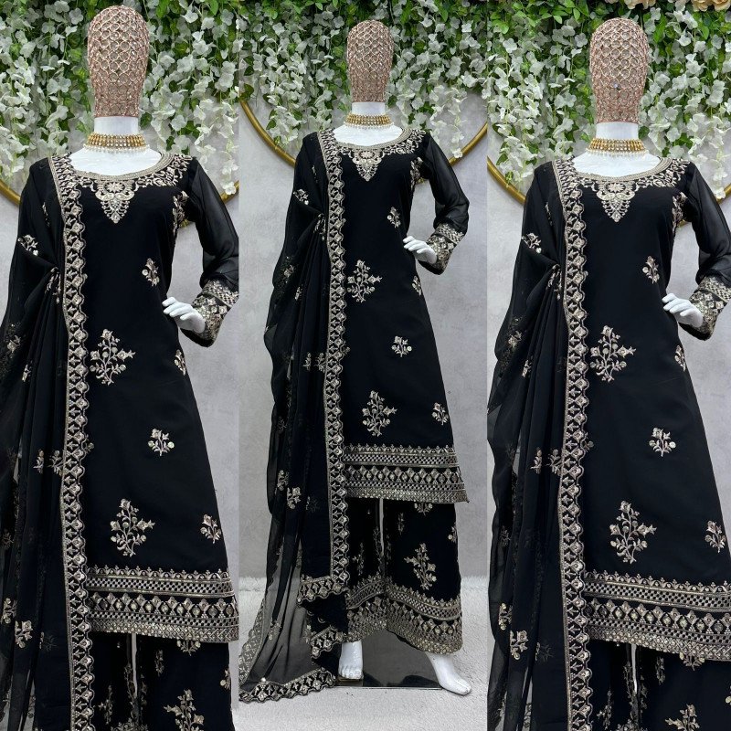 The 48-inch top features exquisite embroidery on both front and back, while the fully stitched plazo comes with an elastic waistband for a perfect fit, accommodating sizes up to 42 inches. The lightweight 2.2-meter dupatta, bordered with lace on all sides, completes the look, offering the ultimate blend of sophistication and modern charm.