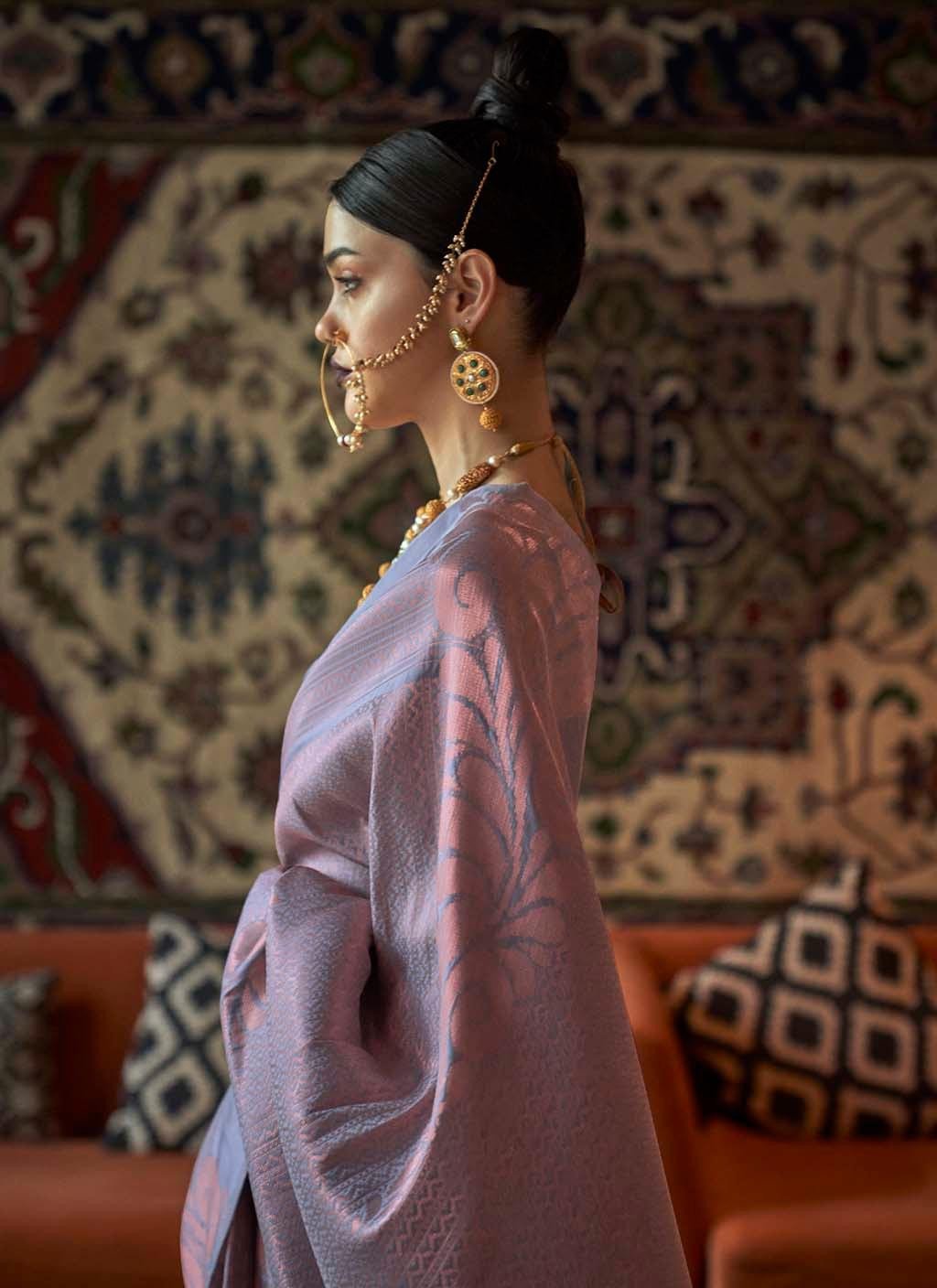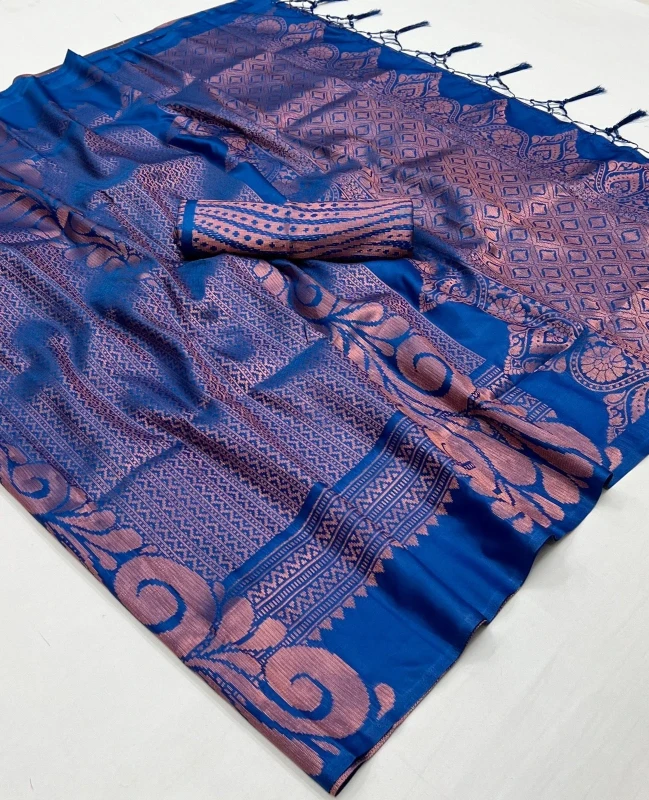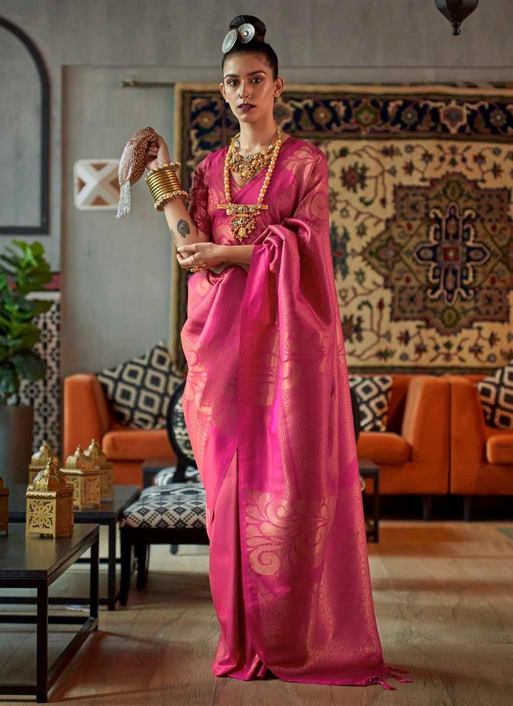 Introducing the Mahanagri Kanjeevaram Saree, a stunning blend of tradition and elegance that embodies the grandeur of Indian craftsmanship. This saree is meticulously woven from the finest Kanjeevaram Silk, renowned for its rich texture and durability. The saree features an intricate design inspired by the vibrant culture and heritage of India, making it a perfect choice for special occasions.  The Mahanagri Kanjeevaram Saree comes with a matching blouse piece, woven with exquisite Zari detailing that adds a touch of opulence to the ensemble. With a generous length of 6.30 meters, this saree drapes gracefully, enhancing your natural beauty and poise.  Ideal for weddings, festivals, or any event where you wish to stand out, this saree is a timeless addition to any wardrobe. To maintain its lustrous shine and intricate detailing, we recommend dry washing.  Proudly crafted in India, this saree is ready to be shipped within 2-3 working days. Please note that the colors may vary slightly due to screen brightness. Elevate your traditional attire with the Mahanagri Kanjeevaram Saree and make a statement of elegance and sophistication.
