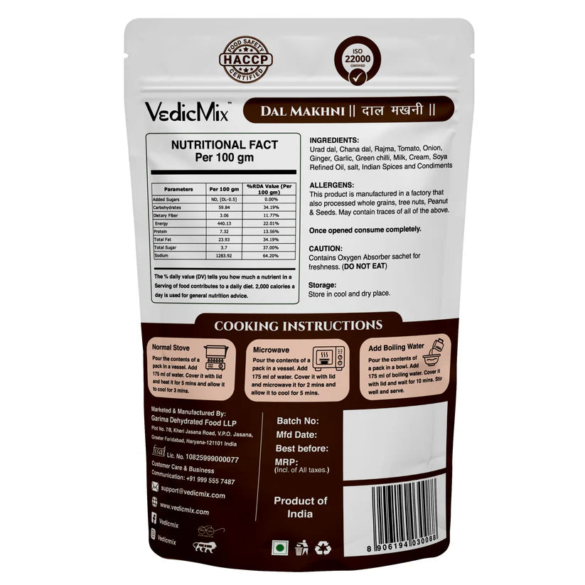 Urad Dal, Chana Dal, Rajma, Tomato, Onion, Ginger, Garlic, Green Chilli, Milk, Cream, Refined Soybean Oil, Salt, Indian Spices, and Condiments.